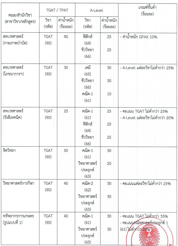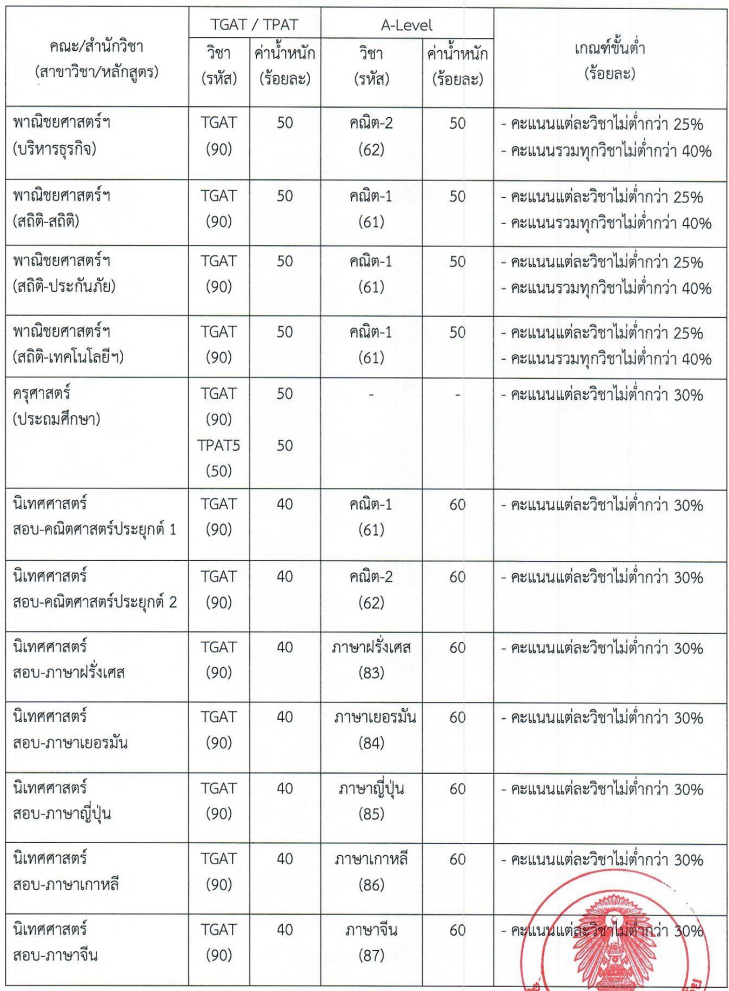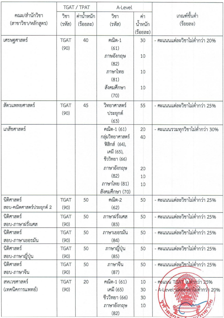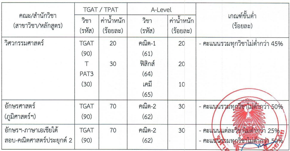 A-Level 70 % วิชา ฟิสิกส์ เคมี ชีววิทยา 40 % คณิตศาสตร์1 20 % ภาษาอังกฤษ 20 % ภาษาไทย 10 % สังคมศึกษา 10 %