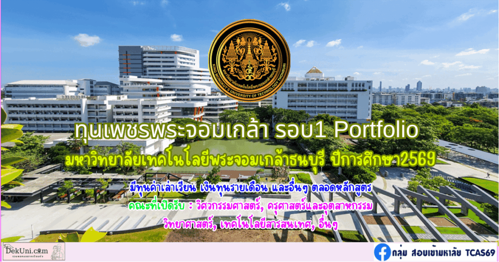 มหาวิทยาลัยเทคโนโลยีพระจอมเกล่าธนบุรี เปิดรับสมัครนักศึกษาใหม่ ทุนเพชรพระจอมเกล้า รอบ1 Portfolio ปีการศึกษา2569 โดยมีรายละเอียดดังต่อไปนี้