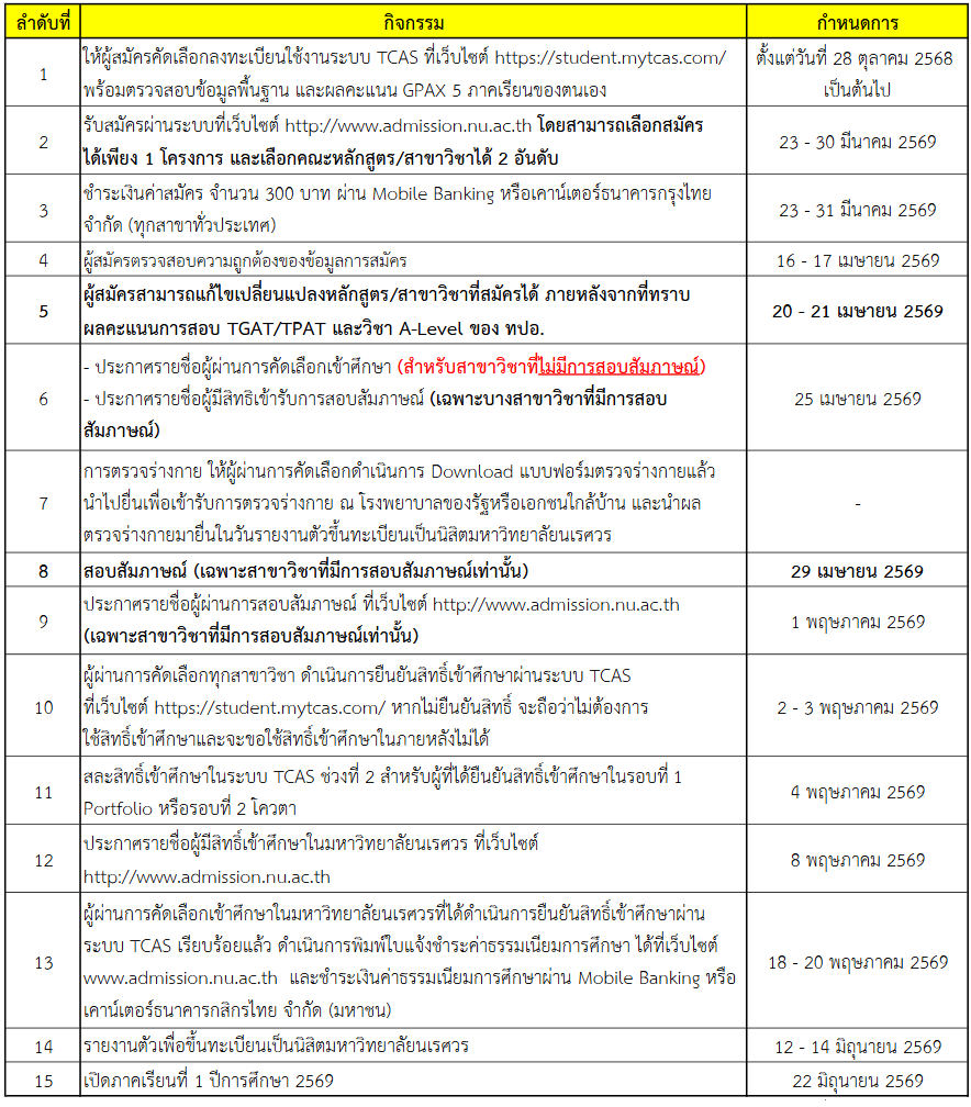 TCAS69 รอบ2 โควตา มหาวิทยาลัยนเรศวร ปีการศึกษา2569